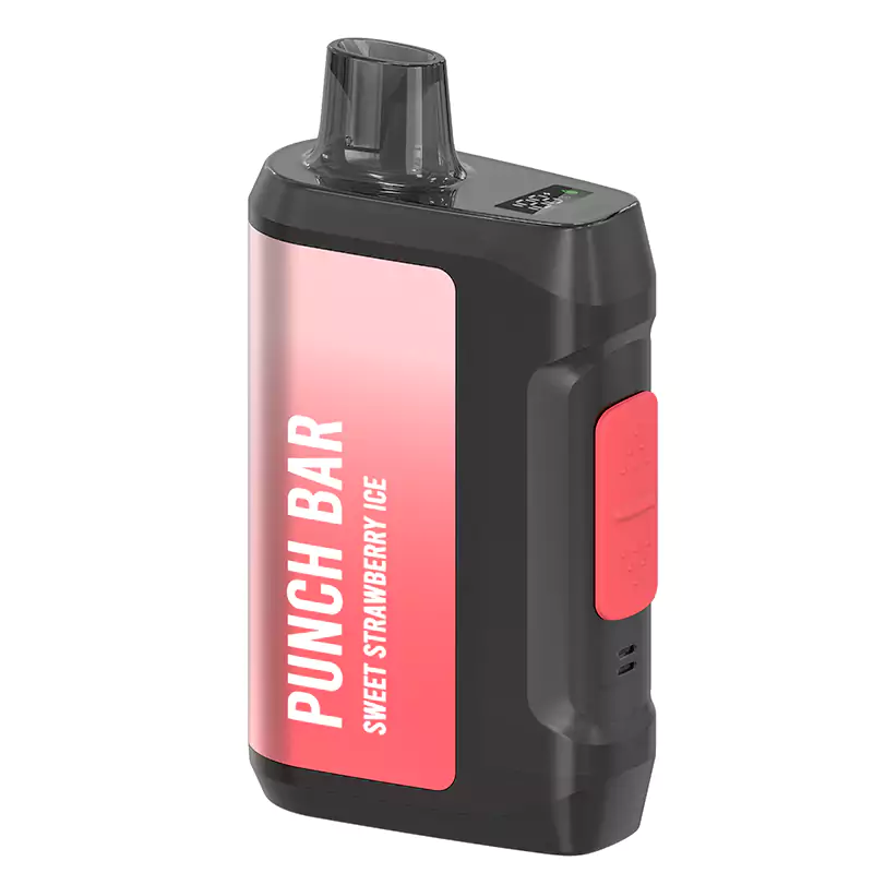 The Punch Bar Disposable Vape Sweet Strawberry Ice with its 10,000 puff capacity, 0.8-ohm mesh coil, and smart screen displaying battery and e-liquid levels. SYNC Tech allows seamless power mode and airflow adjustments, catering to individual preferences. The Punch Bar Disposable Vape Sweet Strawberry Ice With 600mAh rechargeable battery and USB-C charging, it ensures the best possible vaping experience.